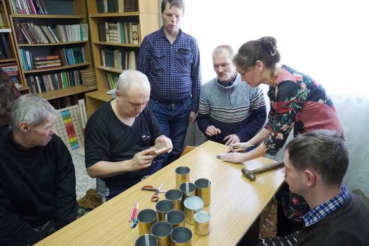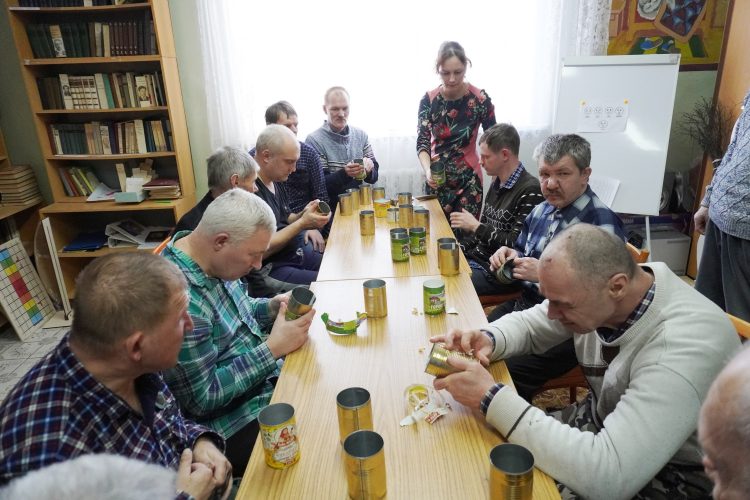 Получатели социальных услуг совместно с сотрудниками готовили основу для окопных свечей: обстукивали банки, снимали этикетки и нарезали картон.