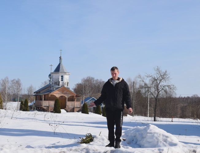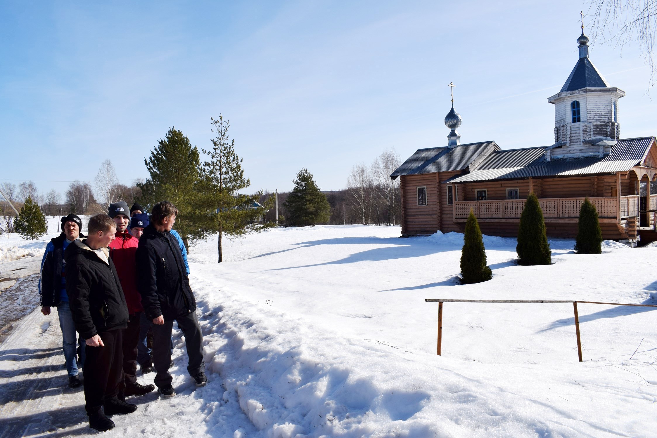 Особый отклик у группы вызвало посещение второго православного строения — небольшой, но очень красивой деревянной церкви Преображения Господня. Здесь экскурсантов встретил смотритель храма Александр Тихонович Черных, бывший директор местной школы, который стал инициатором строительства.