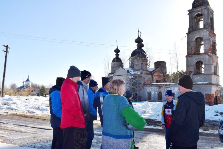 Первым объектом знакомства стала величественная пятиглавая церковь с колокольней, построенная в 1800 году на средства санкт-петербургского купца Ф.Д. Сыренкова. Позже к ней пристроили трапезную. Участники экскурсии с интересом слушали историю храма, который в 1940-е годы был закрыт и использовался как склад Райпотребсоюза. В настоящее время здание, являющееся выявленным объектом культурного наследия, находится в аварийном состоянии, однако внутри еще можно разглядеть основу иконостаса и фрагменты старинных росписей, поражающие своей монументальностью.