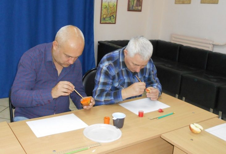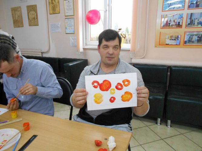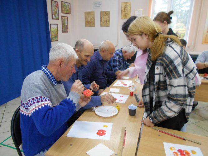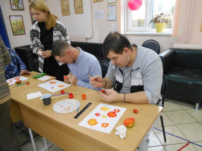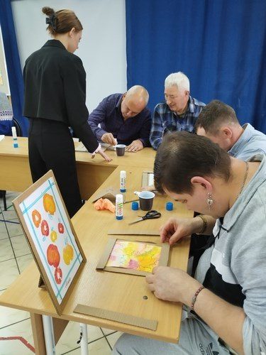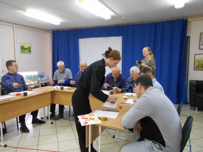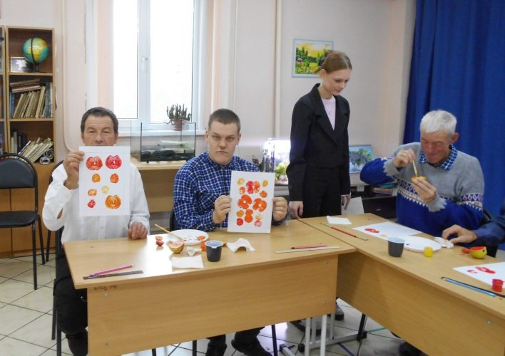 В рамках занятия участники создавали рисунки на бумаге с использованием техники монотипии. В качестве печатных элементов применялись яблоки, картофель и листья. Участники творчески подошли к заданию, используя гуашевые краски жёлтого, красного и оранжевого цветов, смешивая их, создали яркие, оригинальные работы. Студенты-волонтёры подробно демонстрировали технику выполнения работ, оказывали помощь участникам при возникновении затруднений. Студенты колледжа объяснили и показали процесс создания рамки для готовой картины, каждый участник изготовил её для себя. Яркие поделки послужат прекрасным дополнением к оформлению интерьеров жилых комнат.