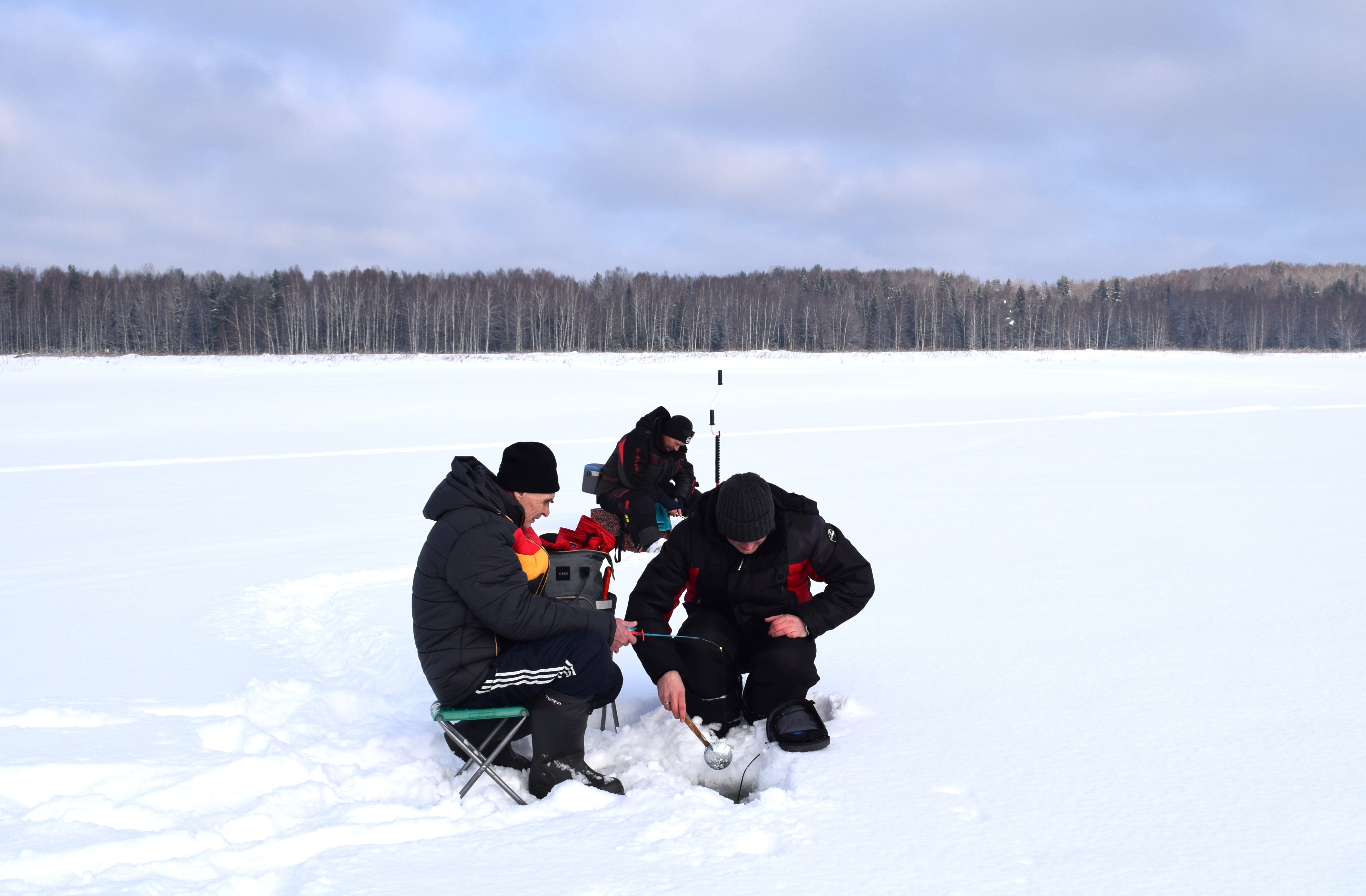 Погода выдалась на загляденье: солнечной и по-зимнему свежей. Наши рыбаки основательно подготовились: теплая экипировка, любимые снасти и, конечно, отличная наживка — мотыль и опарыш.